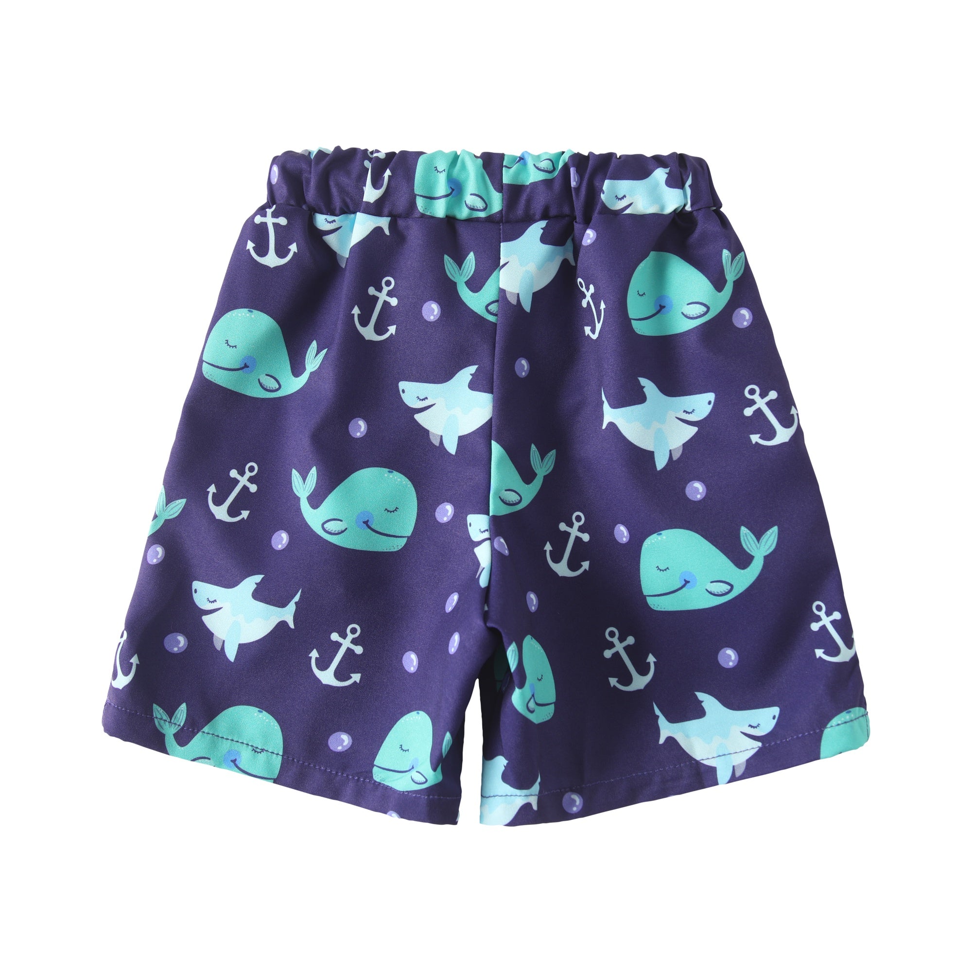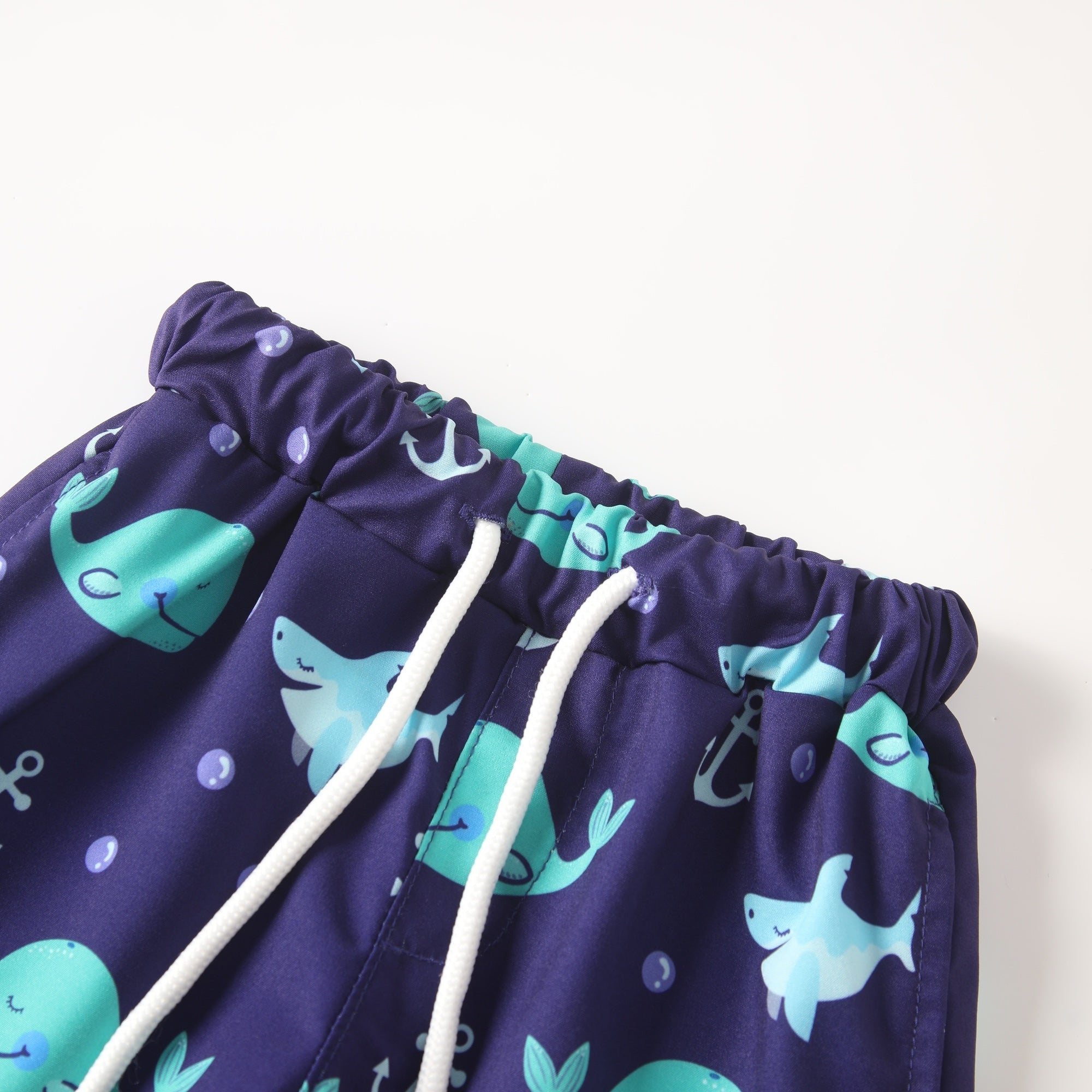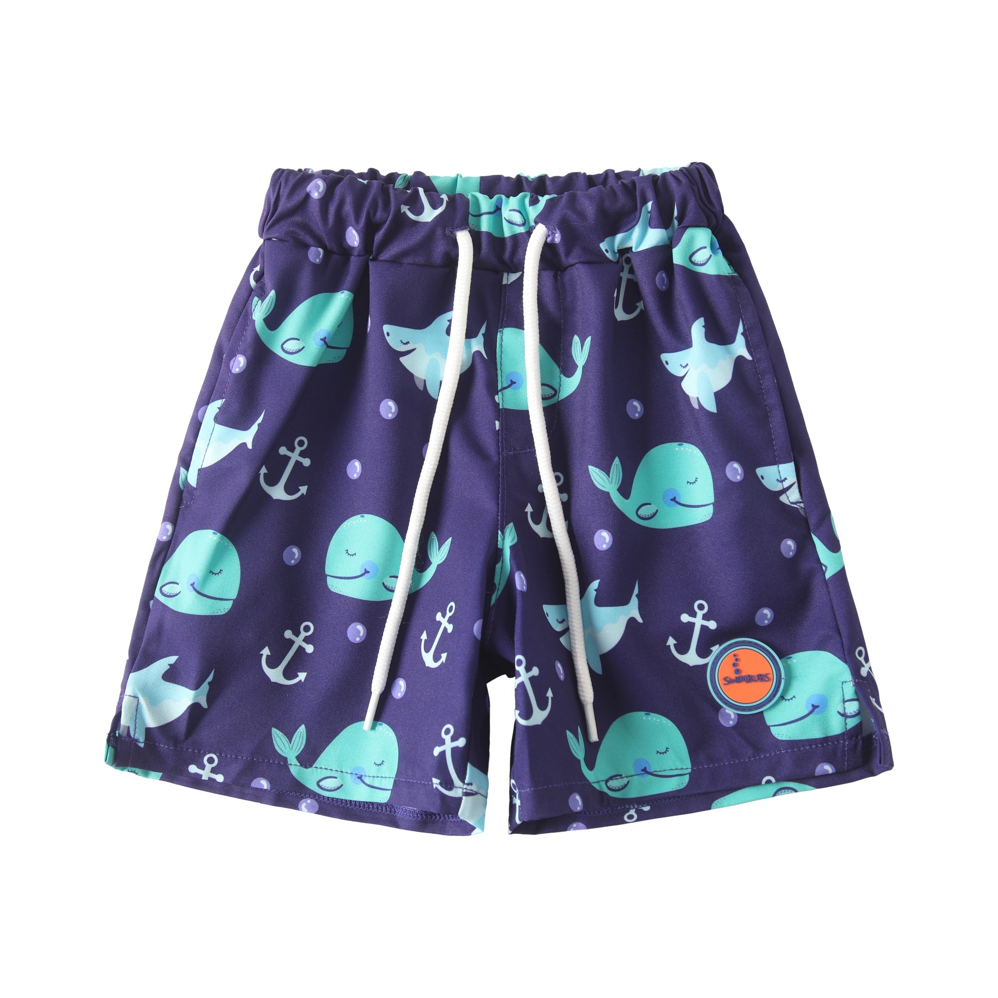 The elastic waistband with functional drawstring provides a comfortable and adjustable fit, helping keep the shorts secure during swimming and active play.